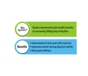 AyuFlex is a plant-based ingredient that helps to support joint health. Made from a standardized extract derived from the dried Haritaki fruit of the Terminalia chebula plant, it offers the benefits of this traditional ingredient used in ancient Indian Ayurvedic practice for health and well-being. Clinical data demonstrates AyuFlex’s ability to support mobility, whilst also aiding recovery from training.